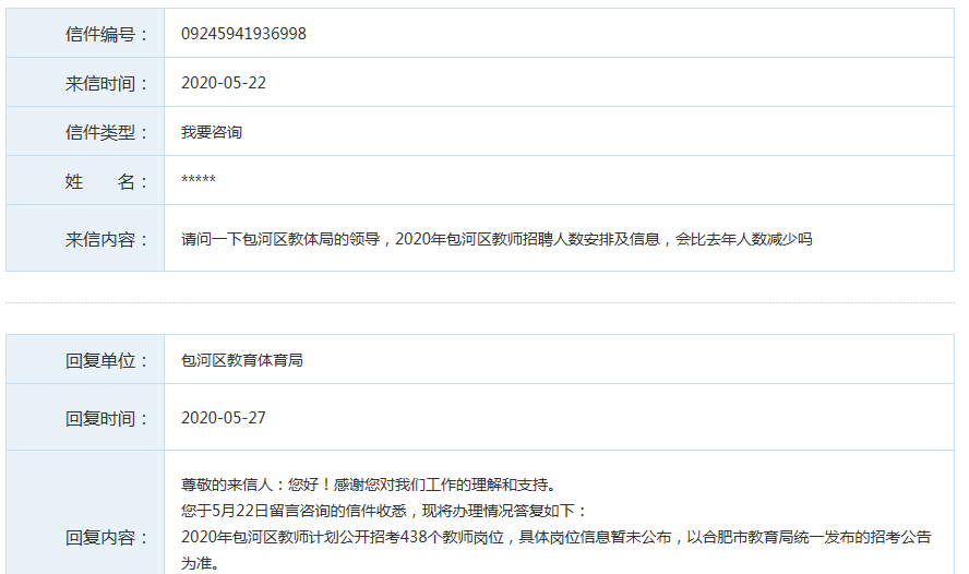 回復(fù)內(nèi)容:尊敬的來信人:您好!感謝您對我們工作的理解和支持。您于5月22日留言咨詢的信件收悉,現(xiàn)將辦理情況答復(fù)如下:2020年包河區(qū)教師計劃公開招考438個教師崗位,具體崗位信息暫未公布,以合肥市教育局統(tǒng)一發(fā)布的招考公告為準(zhǔn)。