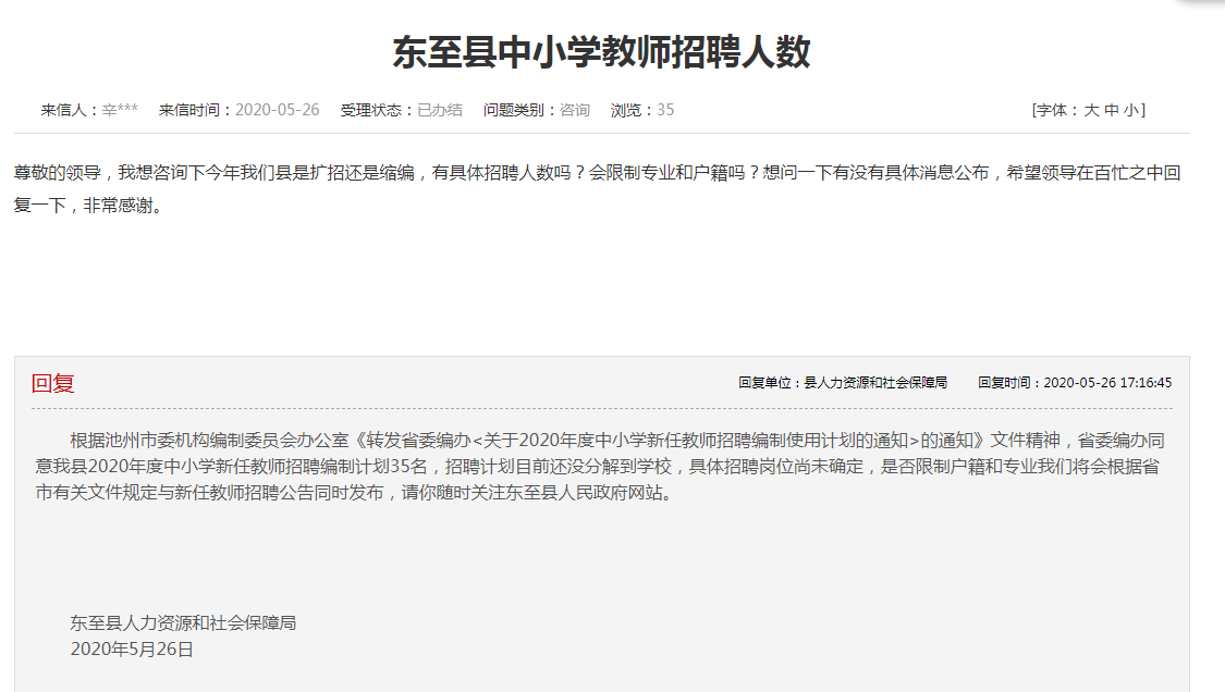 縣人力資源和社會保障局回復(fù)根據(jù)池州市委機構(gòu)編制委員會辦公室《轉(zhuǎn)發(fā)省委編辦<關(guān)于2020年度中小學(xué)新任教師招聘編制使用計劃的通知>的通知》文件精神,省委編辦同意我縣2020年度中小學(xué)新任教師招聘編制計劃35名,招聘計劃目前還沒分解到學(xué)校,具體招聘崗位尚未確定,是否限制戶籍和專業(yè)我們將會根據(jù)省市有關(guān)文件規(guī)定與新任教師招聘公告同時發(fā)布,請你隨時關(guān)注東至縣人民政府網(wǎng)站。