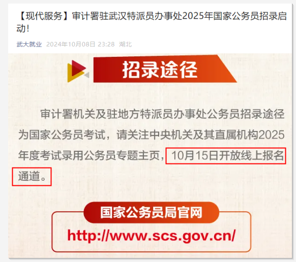 重要通知!2025年國考報名時間定啦!昨晚,武大就業(yè)發(fā)布《審計署駐武漢特派員辦事處2025年國家公務員招錄啟動!》,其中提到:2025國考將于10月15日開放報名通道。